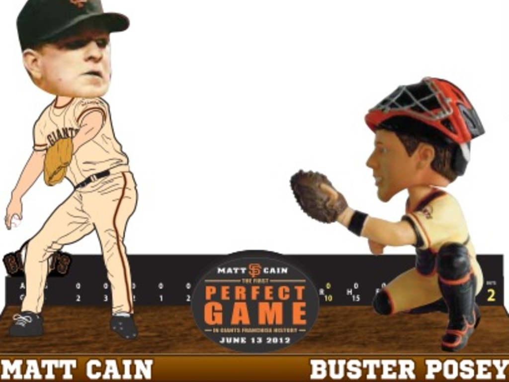 SF Giants Perfect Game Matt Cain/Buster Posey Bobblehead!!! “I am raising funds to have a bobblehead made depicting Matt Cain pitching the final out to Buster Posey, from the SF Giants first perfect game in franchise history! I would have just made one for myself, but unfortunately manufacturers do not make individual bobbles, so they require a minimum order to get anything produced. As pictured, it will have Matt Cain pitching and Buster Posey in the squat, with a brown base and scoreboard in the background. Their names will be displayed underneath them as well, and a Perfect Game logo will be displayed in between them. It will be limited and hand numbered to only 144. Any and all amounts of pledges are welcome and much appreciated, and pledges over $55 (plus shipping & handling) will be able to receive one of the Matt Cain/Buster Posey bobbleheads too!” More details here.