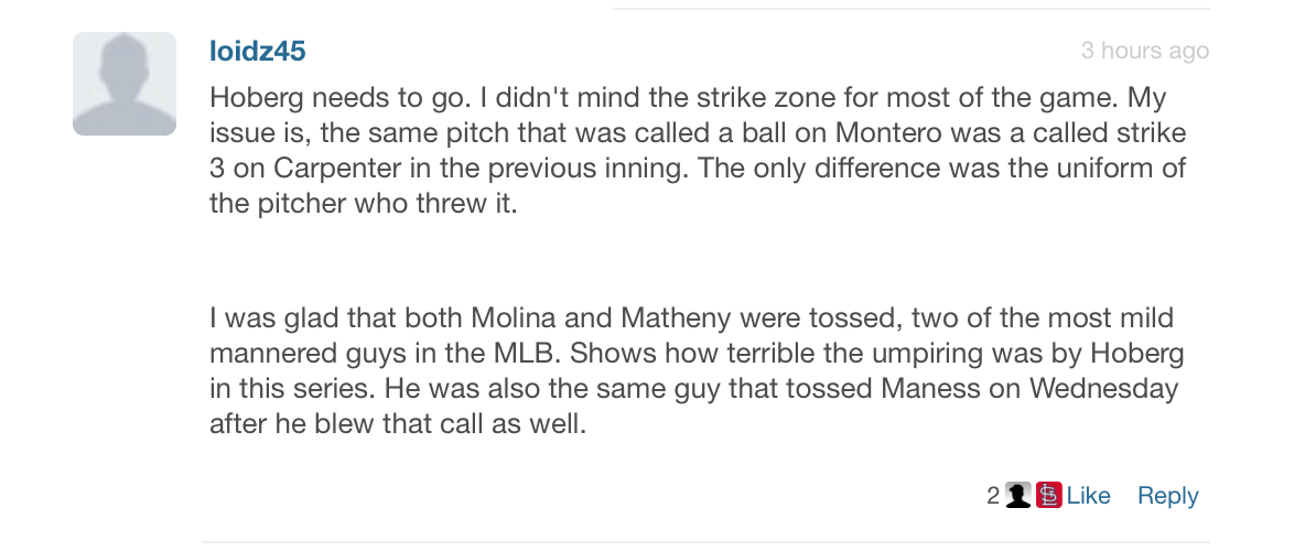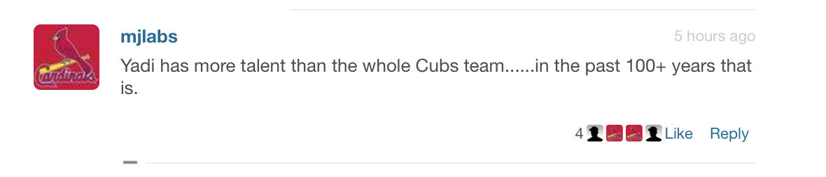 Let’s check in on how Cardinals fans are reacting to the ejection of Saint Yadi of Bayamon and Mike Matheny last night: