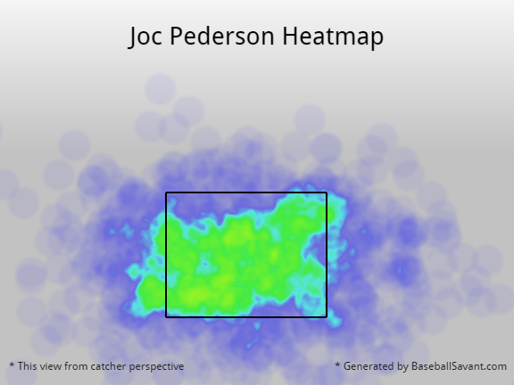 Luckily, it would seem that each of those questions might be answered with one piece of information: Joc wasn’t hitting the ball nearly the same way he was in the first half, in two ways. First, he was hitting the ball a lot softer than he was before the All-Star break. FanGraphs breaks batted balls into three categories based on exit velocity – soft, medium, and hard. In the first half, 14.9% of Joc’s batted balls fell into the “soft” category, 43.6% fell into the “medium” category, and 41.5% fell into the “hard” category. In the second half, those numbers were 29.4%, 40.3% and 30.3%, respectively. To quantify this data, he averaged 93.5 MPH exit velocity in the first half, and 89.3 MPH in the second half, dropping over 4 MPH. Pederson also hit far more balls to the opposite field in the second half, with his pull/middle/away rates changing from 45.1%/36.9%/18.0% in the first half to 41.2%/31.1%/27.7% in the second half – a significant shift in where Pederson was hitting the ball. So, finally, it might be a good idea to explore just why Pederson started hitting the ball worse in the second half.