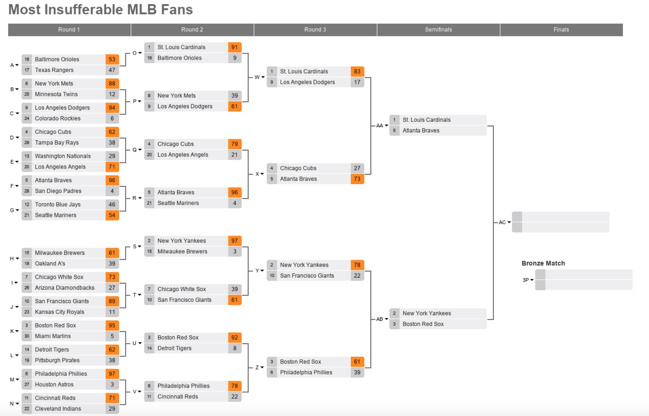 The full bracket for Ball Eight’s inaugural Most Insufferable MLB Fans contest is below (click to enlarge).